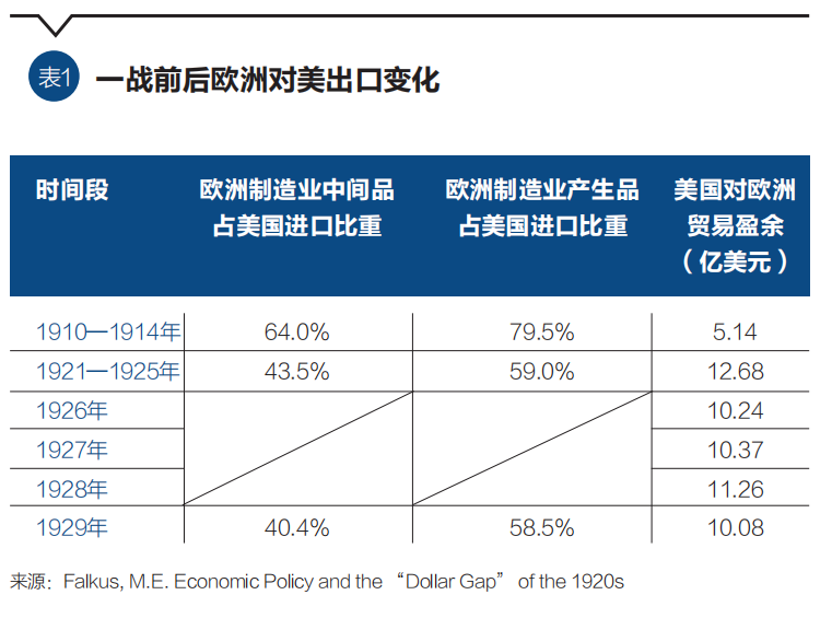 一方面,美国单边主义经济政策通过国际贸易和金融体系对全球造成广泛冲击。一是贸易保护主义政策可直接扰动全球贸易流动,压缩主要出口国外部市场空间,抑制外部需求,冲击贸易和经济的增长势头。例如,20年代,美国实施高关税政策,显著削弱了欧洲商品在美国市场的竞争力,导致其制造业中间品与产成品对美出口大幅萎缩,欧洲对美国贸易赤字大幅上升(表1),欧洲国家偿还对美外债压力骤增,经济复苏进程明显受阻。二是美国货币金融霸权扩大了其国内宏观政策的全球传导效应,使全球金融波动与风险上升。例如,70年代,美国重建以美元为核心的浮动汇率体系,强化了全球金融市场的一体化融合及跨境资本的自由流动,显著增强了美国货币政策的外溢性。80年代,美联储大幅加息导致美国融资成本飙升,特别是拉美国家在70年代积累大量美元债务,在面临利率上升、本币贬值的双重压力下,最终陷入严重的债务危机,经济增长长期失速。