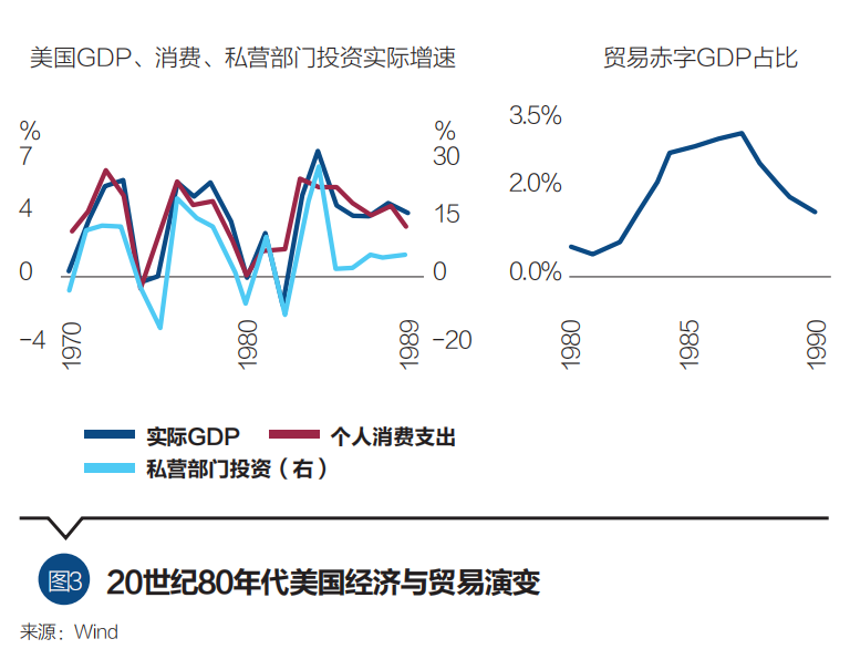 一是对外贸易打压、对内减税、去监管等供给侧改革的政策组合通常会在短期内推动美国经济与金融市场实现反弹,并带来一定的贸易结构改善。20年代,哈丁—柯立芝政府通过减税与去监管政策激发了美国居民消费和企业投资热情,科技创新意愿增强,叠加战后军人回国及城市化加速带来的内需扩张,推动经济由消费与投资的需求扩张双轮驱动实现复苏。同时,欧洲对美国商品的高依赖度,使其难以对美实施有效的关税报复性措施,美国1922—1929年出口、进口、贸易盈余分别增长36.8%、41.3%和17.1%(图1),制造业规模持续扩大。70年代,尼克松政府推动美元脱钩黄金后大幅贬值,短期内有效提升了出口竞争力,缓解了贸易赤字压力。叠加供给侧刺激政策及宽松货币政策组合,美国经济1972—1973年出现短暂反弹,两年平均实际GDP增速达5.5%,失业率下降(图2)。80年代,里根的大规模供给侧改革政策有效提振了居民消费与企业投资。1983—1989年的年平均增速分别达4.4%和6.6%,同期年均实际GDP增速超4.4%,显著高于70年代。1985年《广场协议》后美元大幅贬值也在短期内进一步改善了出口条件,80年代后期贸易赤字明显收窄(图3)。