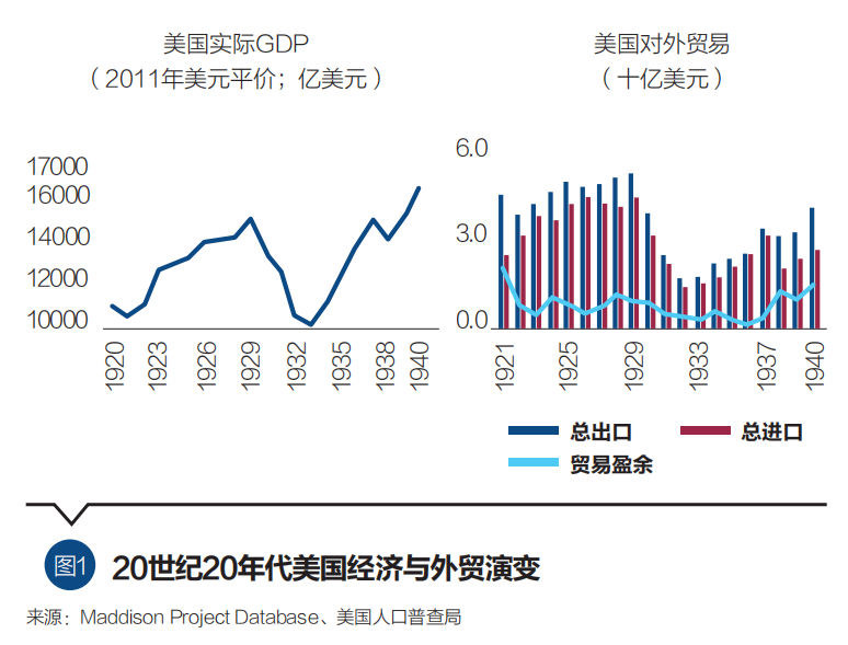 在国际,一战期间,传统欧洲列强(英、法、德等)大批进口美国农业和军工产品,并向美国大量借款,导致其在商品和金融领域对美国的依赖性大幅上升。1913—1917年,美国对欧洲的出口总额由14.79亿美元增至40.62亿美元,并由净债务国变为净债权国,1917年其对外净贷款余额达到66亿美元,占美国当年GDP的11%。一战结束后,欧洲各国的财政赤字、债务和通货膨胀等问题加剧,加之1918—1919年“西班牙流感”的暴发进一步加大了欧洲经济复苏的难度,使欧洲更加难以减少对美国的依赖。这些情况为美国扩大全球影响力并塑造经济金融霸权,提供了难得的机遇。