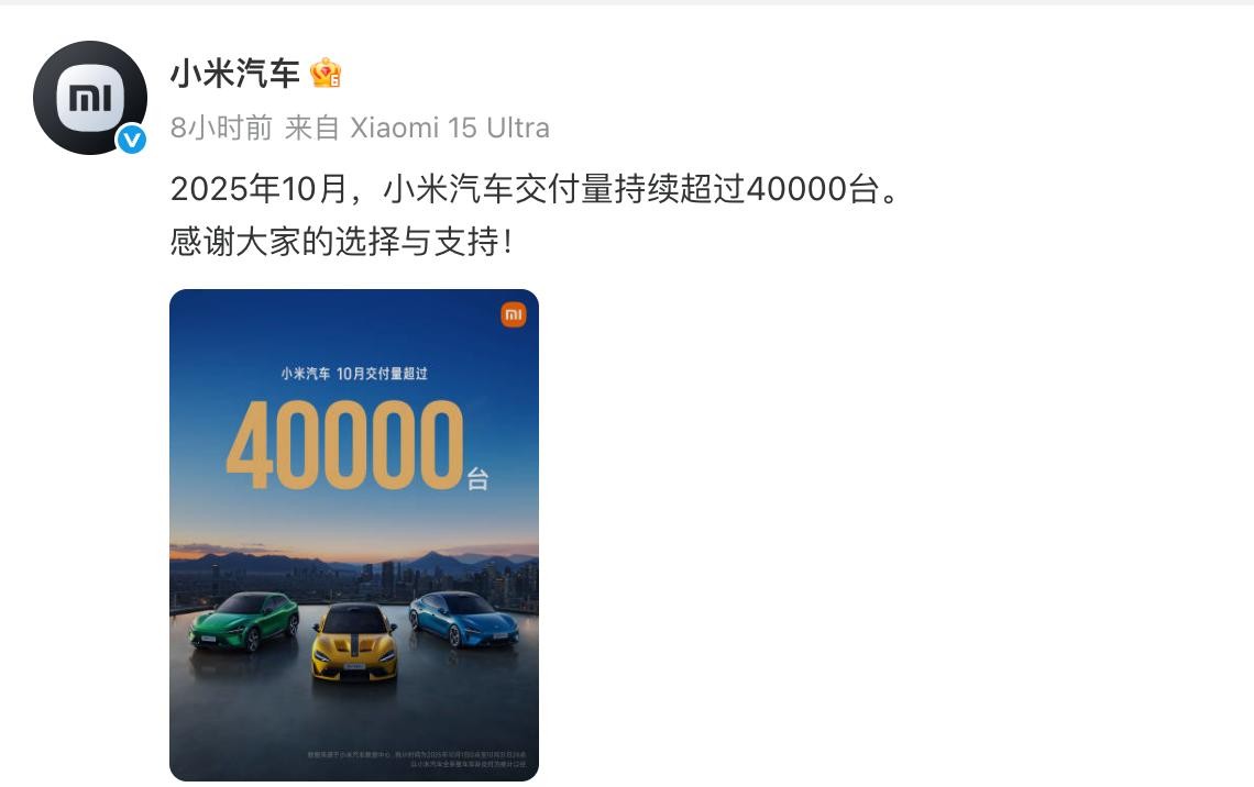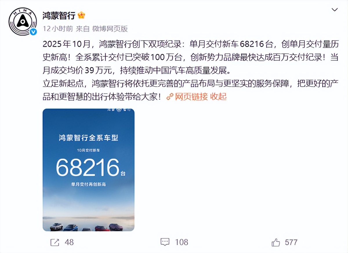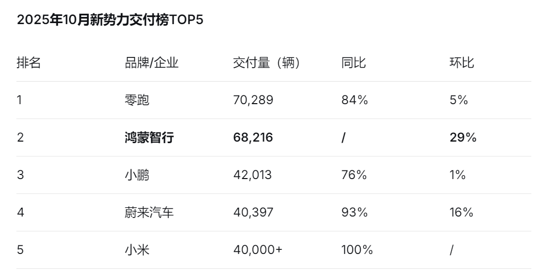 从10月的交付总量来看,零跑汽车以70,289辆的惊人成绩登顶,紧随其后的是鸿蒙智行,交付了68,216辆。小鹏、蔚来、小米则分别以42,013辆、40,397辆和“40,000+”的成绩,占据了第三至第五把交椅。这份TOP5名单,既有久经沙场的老将,也有势头凶猛的后来者,共同勾勒出当前新能源市场活力四射又充满变数的图景。